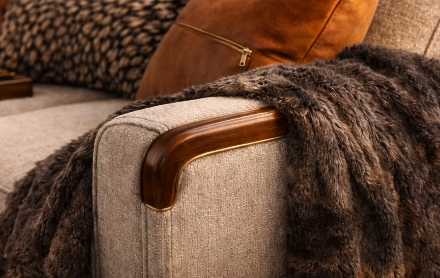 Why do we love accessorizing our sofas? It’s called Biophilia and Nesting. The Safe Zone: Our brains are wired to seek out “dens.” By adding wooden armrest trays or carved side bolsters, we create a defined, secure space that lowers cortisol (stress hormones).